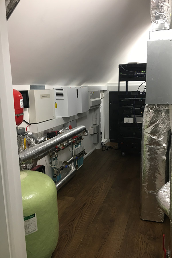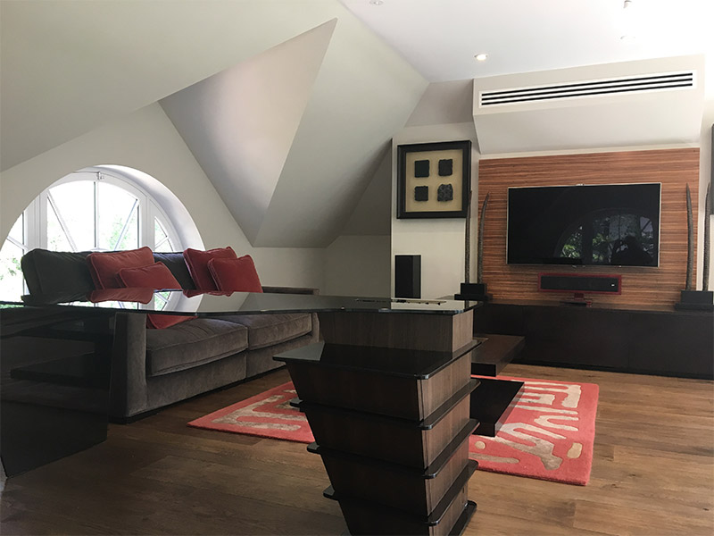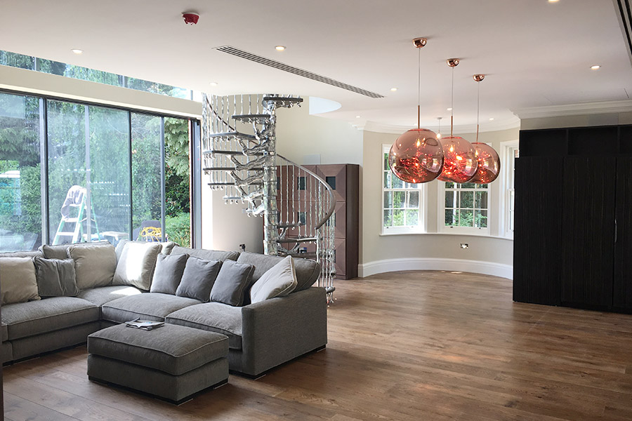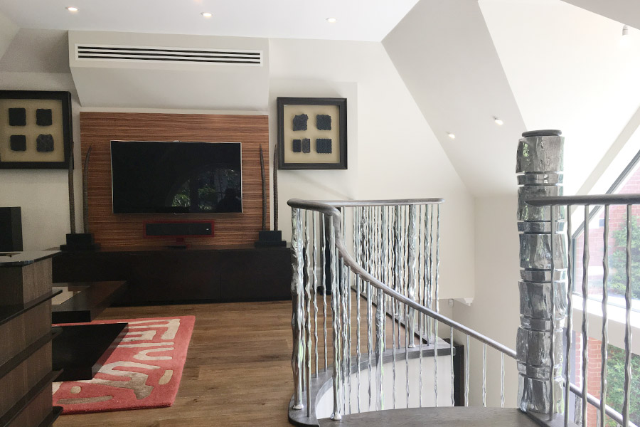 Inside we opened up a side wall to connect the new extension with the existing house. We continued the wooden floor throughout including on the mezzanine and installed a feature staircase by Zig Zag. An internal fit-out incorporated comfort cooling and under floor heating which is serviced by an external air source heat pump and smart lighting by Lutron and controls by Control 4 were installed.